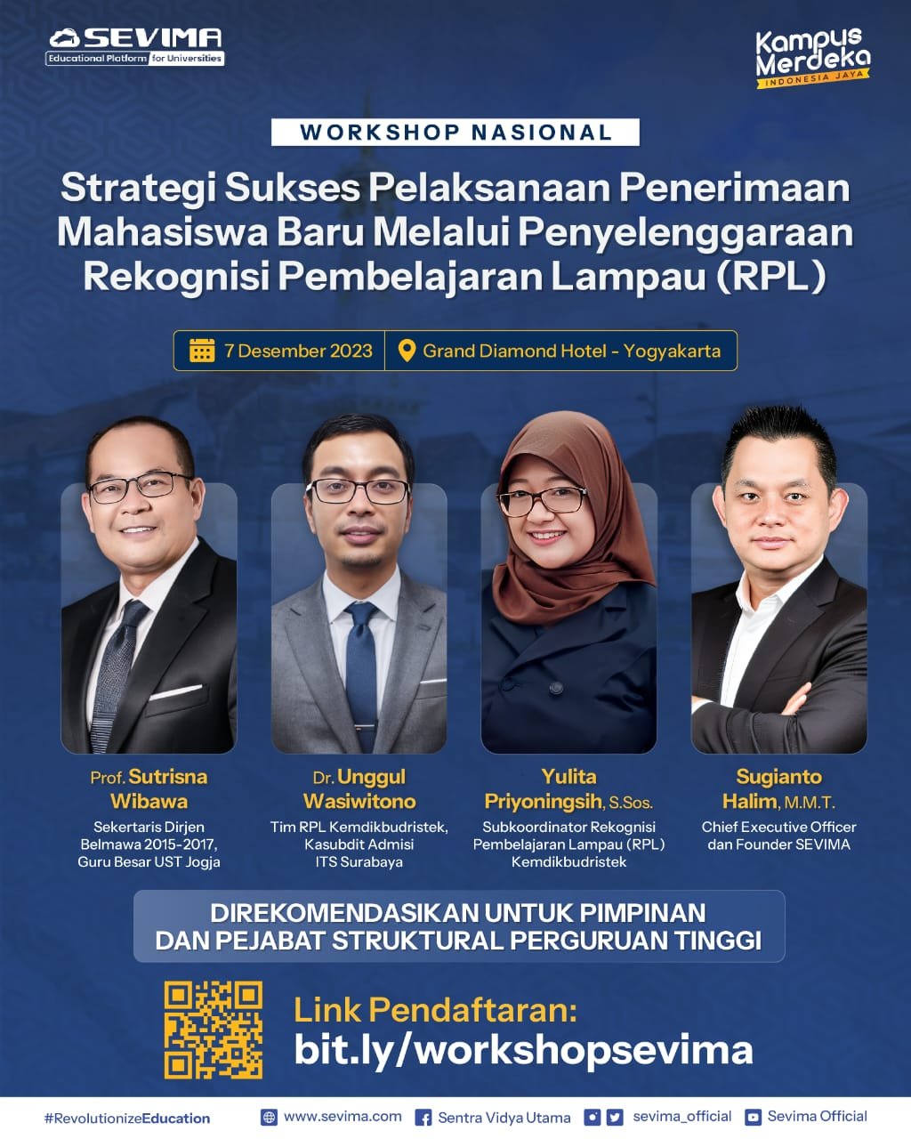 Acara ini menghadirkan narasumber terkemuka, yakni diantaranya, Dr. Eng. Unggul Wasiwitono, seorang Tim Ahli RPL Kemdikbudristek, sekaligus Kepala Sub Direktorat Admisi (Penerimaan Mahasiswa) ITS Surabaya. KemudianYulita Priyoningsih, S.Sos., yang saat ini menjabat sebagai Subkoordinator RPL, Direktorat Pembelajaran dan Kemahasiswaan (Belmawa), Kementerian Pendidikan Riset Kebudayaan dan Teknologi (Kemdikbudristek), serta yang terakhir adalah Prof. Sutisna Wibaya, yang saat ini bertugas sabegai Kepala Lembaga Pengembangan Universitas Sarjanawiyata Tamansiswa Jogja, sekaligus Praktisi RPL, serta pernah menjabat sebagai Sekretaris Dirjen Belmawa periode 2015-2017.